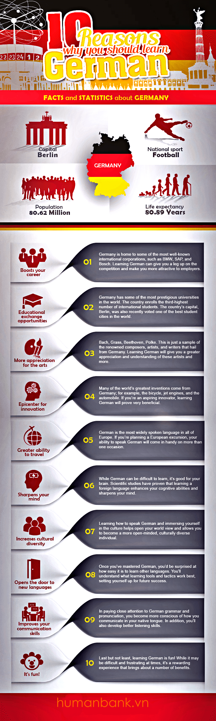 Bạn cần thuyết phục những người khác trong cuộc sống của bạn học nói tiếng Đức? Hãy In ra bản đồ họa thông tin này với thông tin chi tiết ở trên và treo nó lên tường của bạn - bạn chắc chắn sẽ thuyết phục họ tìm hiểu và học tiếng Đức!