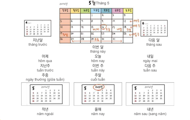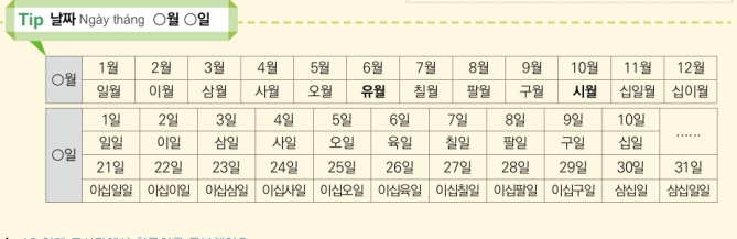 ❤️ 월 일 (tháng, ngày) : Là từ dùng khi nói về ngày, tháng. Khi biểu hiện tháng thì dùng “ 월” và khi biểu hiện ngày thì dùng “일”.