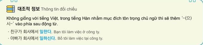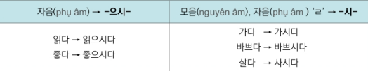 => Hình thức ngữ pháp được biểu thị sự tôn kính chủ thể của "-시-" và nó thường được chia ở dạng "-(ㅡ)세요. Thời hiện tại ta chia là "-(ㅡ)세요 và thời quá khứ "-(으)셨어요". Một số động từ "먹다, 있다, 자다" khi thêm "-시-" sẽ được chuyển thành các từ vựng như "잡수시다/드시다(먹다), 계시다(있다), 주무시다(자다)".