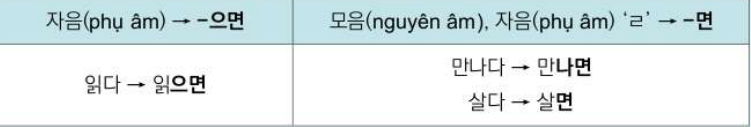 ❤️ Thông tin đối chiếu: Trong tiếng Việt, khi nói giả định một điều gì đó dùng cấu trúc "Nếu + chủ ngữ + động từ/ tính từ, vế sau của câu", nhưng trong tiếng Hàn dùng cấu trúc "chủ ngữ + động từ/ tính từ + 면 + vế sau của câu".
