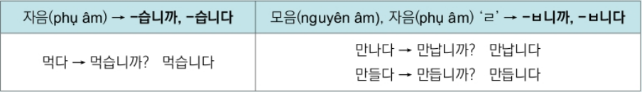 ❤️ Thông tin đối chiếu: Trong tiếng Hàn khác trong tiếng Việt là nhất định phải chia đuôi câu kết thúc cho động từ hoặc tính từ. "-ㅂ/습니까" là đuôi câu kết thúc cho câu nghi vấn, và "-ㅂ/습니다" là đuôi câu kết thúc cho câu khẳng định.