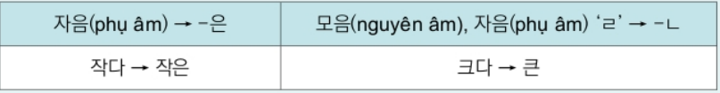 + Nếu thân tính từ có phụ âm cuối trừ âm "ㄹ":-은 (Sau "있" và "없" chúng ta dùng "는").