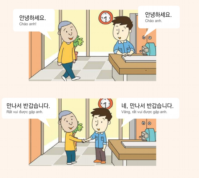 + "안녕하십니까" (annyeongha simnikka) - Chào hỏi trang trọng (dùng trong tình huống gặp những người lớn tuổi, chức vụ cao, người gặp lần đầu).