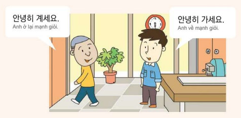 + "안녕히 계세요" (annyeonghi gyeseyo) - Chào tạm biệt khi ai đó đi ra ngoài.