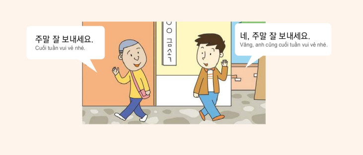 B: 네, 주말 잘 보내세요. Vâng, Anh cũng cuối tuần vui vẻ nhé.