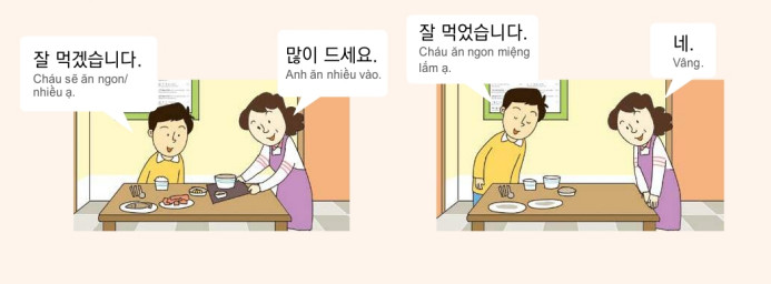 + " 많이 드세요/많이 먹어요"(Sử dụng với người lớn/ngang hàng hoặc nhỏ hơn): Bạn ăn nhiều vào nhé!