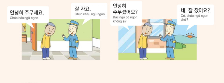 + " 안녕히 주무셨어요". /an-nyong-hi-chu-mu-syok-so-yo/: Chúc ngủ ngon. Đây cũng là kiểu chào hỏi để mang đến sự trang trọng, lịch sự.