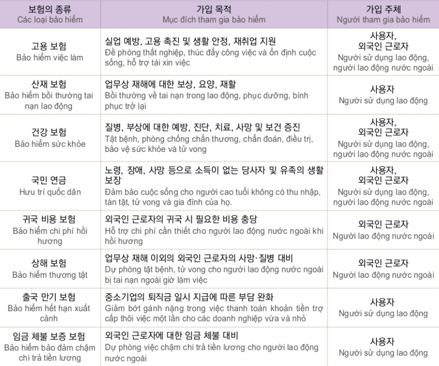 Bốn loại bảo hiểm thì phải được quản lý bởi quốc gia nhằm mang lại phúc lợi cho người dân. Đối tượng thuộc diện tham gia bảo hiểm thì phải phải có nghĩa vụ tham gia mua bảo hiểm. Bảo hiểm hưu trí, bảo hiểm sức khỏe quốc dân, bảo hiểm việc làm, bảo hiểm bồi thường tai nạn lao động. Trường hợp người lao động nước ngoài cũng phải tham gia mua bốn loại bảo hiểm như người lao động Hàn Quốc (Riêng bảo hiểm việc làm là tự nguyện tham gia, bảo hiểm hưu trí quốc dân được áp dụng giữa các quốc gia có hiệp định thỏa thuận về việc này).