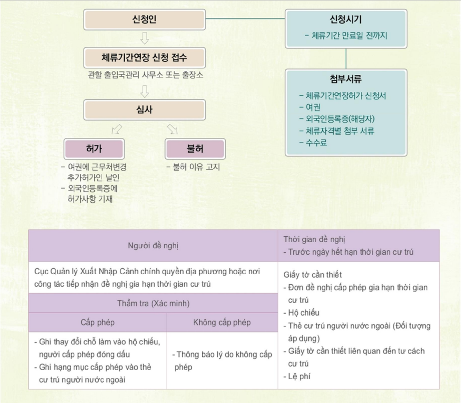 Nếu người nước ngoài muốn tiếp tục cư trú tại Hàn Quốc sau khi thời gian cư trú đã quá hạn thì phải nhận được cấp phép gia hạn thời gian cư trú.