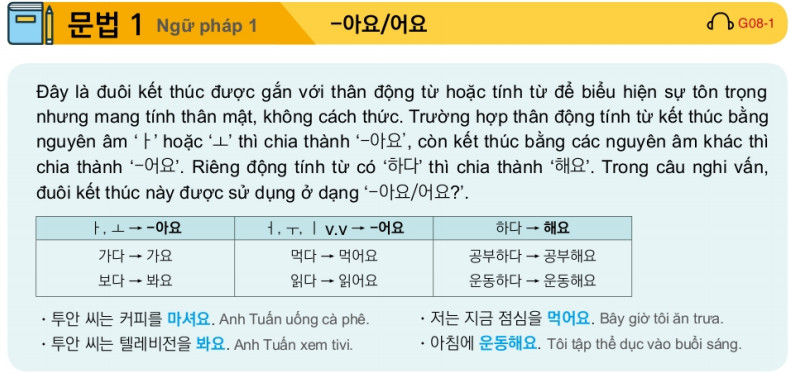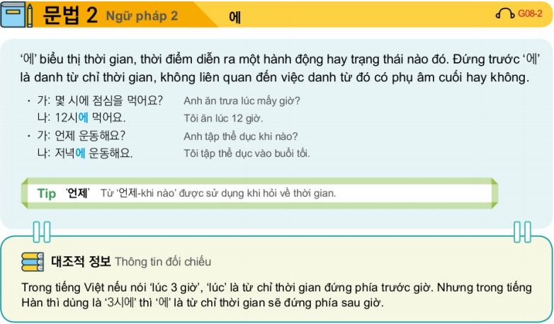 | 8 | 이침/점심/저녁을 먹다 | Ăn sáng/ăn trưa/ăn tối |