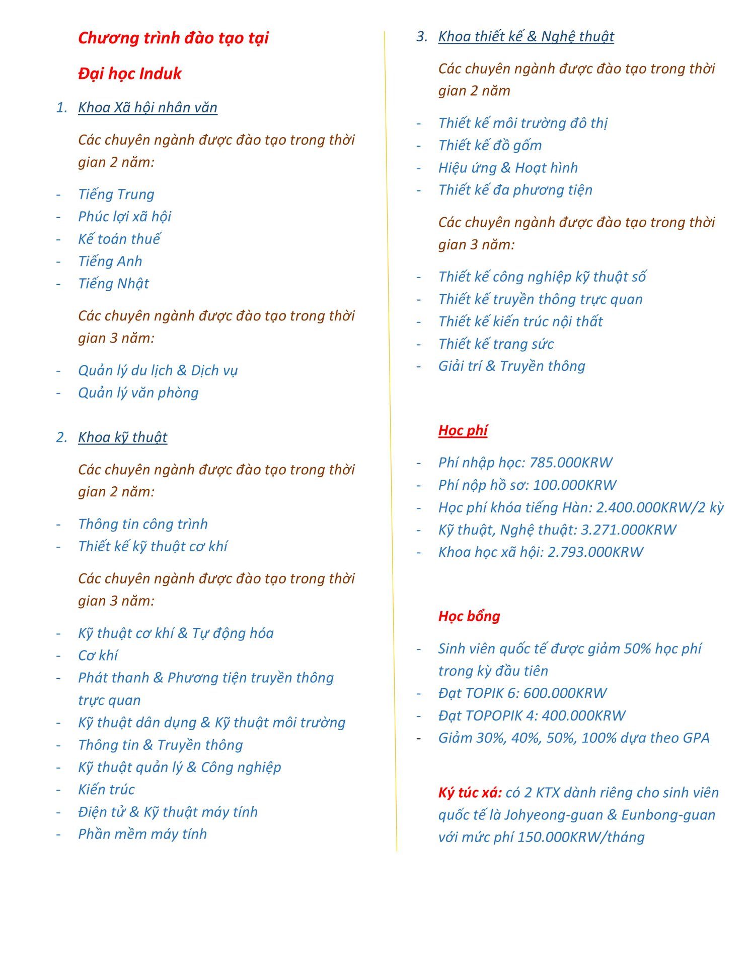 - Trường đại học Induk không có bất kỳ thông báo chính thức nào về các điều kiện chi tiết trong việc trao học bổng cho du học sinh quốc tế. Tuy nhiên, hàng năm trường đại học Induk vẫn có nhiều chương trình học bổng trao cho sinh viên.